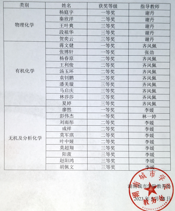 为迎接2023年7月在湖南科技公司举办的湖南省老员工化学化工学科竞赛,按照省赛模式,伟德国际VICTOR1946于5月15日晚举行了初试(理论考试),共80名同学参加。根据初试成绩,33位同学进入复试(实验考试),复试于5月17日下午进行,最终25名同学获得相应奖项,获奖名单如下: