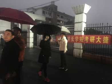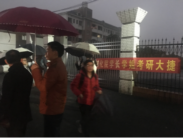 班主任刘淑云老师,辅导员陈艳姣老师也在冒雨送考