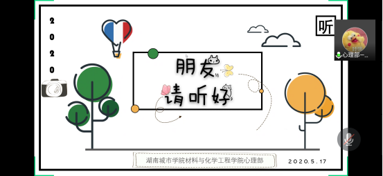 在新冠疫情爆发的宅家期间,为了将比邻而居的温暖传递到远隔千里的同学们身边,伟德国际VICTOR1946心理部于2020年5月17日晚八点举行了线上“朋友请听好”活动,并以文章的方式分享同学们的宅家生活。本次活动由伟德国际VICTOR1946各部门干事刘欢、孔舒婷、封宇航、伍楚楚、刘晶宁主持,学工办副主任田雪萍老师、辅导员潘赛老师、团学会主席李起琼学长出席了此次活动。