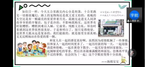 活动一开始,主持人们带领着同学们逐步走入自己与他人的疫情防控期间的“小故事”中。在这个故事集锦中,同学们自愿分享“宅家日志”:有跟妈妈学会做美食的美女同学,有对湖南小龙虾的制作食用大谈特谈的“美食达人”,有去学会采茶制茶的小男生,也有努力却依然难以驾驭太极拳的“体育网课困难生”,有因为网课划水且考试临近而慌张的“期末自学狂人”,也有因为家中变故的打击而产生对未来的迷茫与思考的同学等,通过此次活动我们知道了宅家生活也不只有欢声笑语,也有烦恼和忧愁:但是随后同学们自由交谈环节提及最多的仍是对“祖国最美逆行者”的赞美,充满对国家,民族的爱,对这次全国抗疫的信心期盼!活动的最后,主持人和老师们中肯的提出了一些在家调节活动,如:适量增强运动,可以每天抽出一小时左右的时间来运动,运动可以促使人体产生一种名为内啡肽的物质,帮助我们感受欢愉和满足;用爱陪伴家人,说一起做家务,一起浇花,一起运动,就会发现彼此的感情促进了,家里会充满爱的氛围;制定合理的期末复习计划,好好迎接我们线上课程的学习效果,当我们有目标时生活带给我们的是更多的动力;阅读一本书籍,我们可以利用这段居家时间,静下心来慢慢地读一本有意义的书,弥补平时阅读的不足,进行深度思考;寻求心理支持,如果焦虑情况比较严重,同学们也不要害怕,要去勇敢求助,借助他人的力量,或寻求专业人员的心理支持,克服心理上的恐慌或焦虑等情绪。