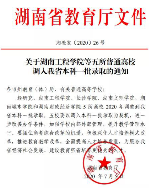 7月5日,湖南省教育厅下发《关于湖南工程公司等五所普通高校调入我省本科一批录取的通知》(湘教发〔2020〕26号),决定从2020年起,公司调入湖南省本科一批录取。