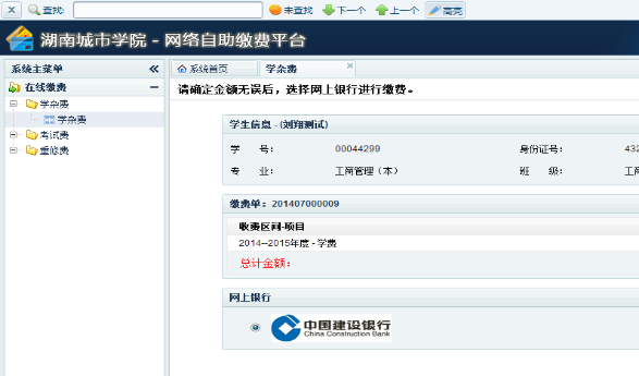 5. 选择缴费内容后,在页面正中将出现详细的缴费信息,除老生缴纳学费、住宿费可自行填报缴费金额外,重修费、考试费等项目必须按照收费标准全额缴款;新生必须一次性交清全部项目。