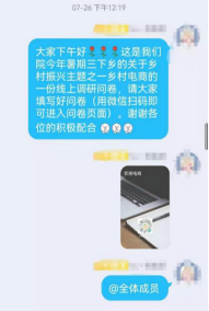 团队成员通过在QQ群、微信群分享调查问卷的方式,向各年级员工或亲朋好友咨询有关农村电商的看法和意见。