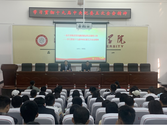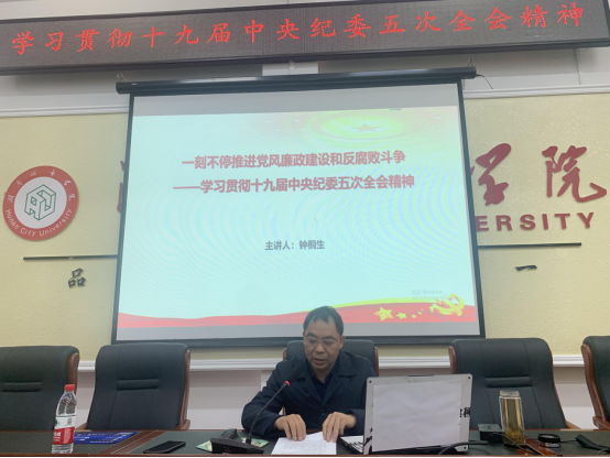 党课的主题是“一刻不停推进党风廉政建设和反腐败斗争--学习贯彻十九届中央纪委五次全会精神”。钟桐生书记从坚定不移推进党风廉政和反腐败斗争;反腐败问题的复杂性;全面从严治党取得新的重大成果;完善党和国家监督体系的重要性;发挥党内监督的主导作用;“三不”一体推进战略的重要意义等多个方面进行了详细的阐述。