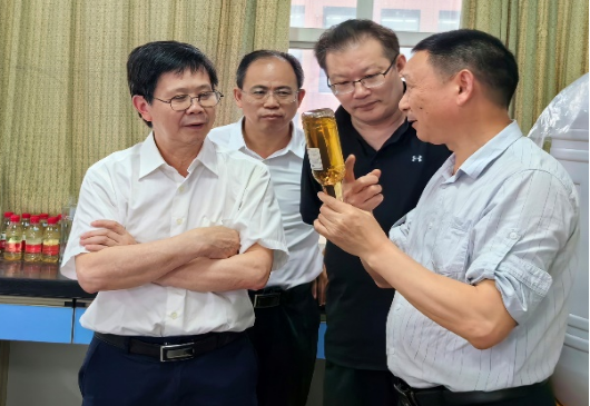 5月16日,湘潭大学原党委书记、湖南大学原副董事长章競一行来公司黑茶实验室考察,公司党委副书记、董事长何振陪同考察。