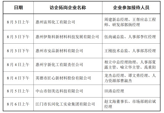 所访企拓岗企业主要对接学是化工、材料方向毕业生,惠州市宙邦化工有限公司是一家专业从事新型电子化学品研发、生产、销售和服务的高新技术企业,主要产品有电容器化学品和锂电池化学品两大系列;惠州伊斯科新材料科技发展有限公司是一家石油化工产品生产企业,主要生产异戊二烯(聚合级)、间戊二烯、双环戊二烯、碳五石油树脂、加氢碳九等;惠州市安品新材料有限公司是一家致力于高分子新材料、纳米材料以及高效催化剂研究开发、生产及经营的高新技术企业平台,是中国工业胶黏剂和特种化学品的主要供应商;惠州宇新化工有限责任公司是一家致力于以LPG为原料,集研发、生产和销售为一体的石油化工企业;英德市匠心新材料股份有限公司是一家主要从事环保PU合成革、超细纤维合成革、生物质PU合成革的自动化、智能化绿色生产与销售的规模性民营企业;中山市创美达科技有限公司是一家以从事化学原料和化学制品制造业为主的企业;江门市长河化工实业集团有限公司是一家以高分子合成新材料为基础,研发创造绿色新材料系统的国家高新科技企业,主要专注于运动地坪、建涂地坪和建筑修缮新材料的研发、销售和应用。
